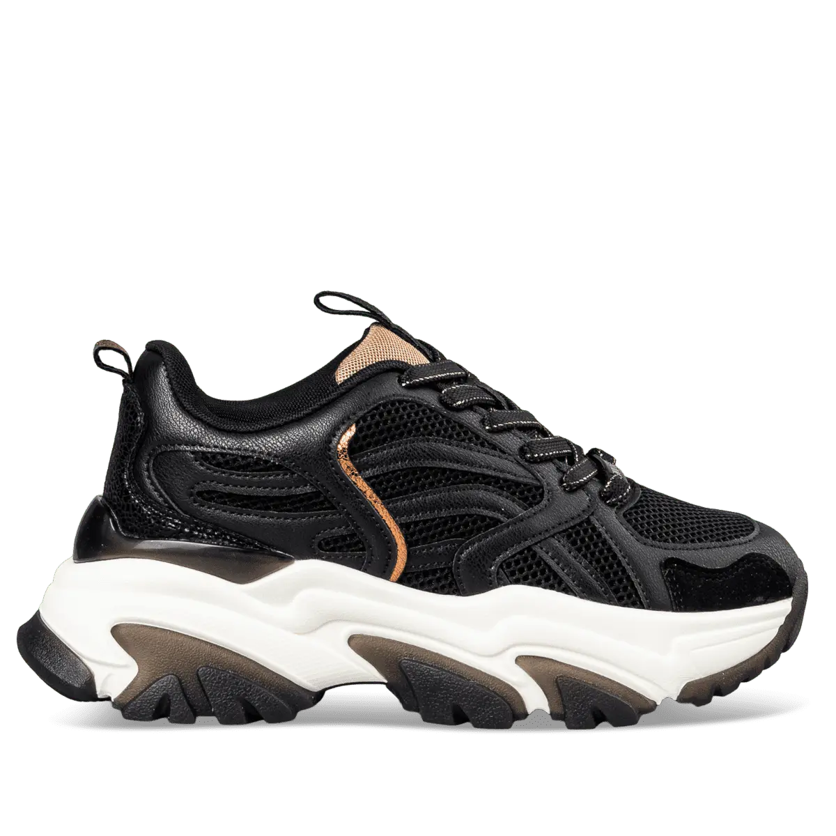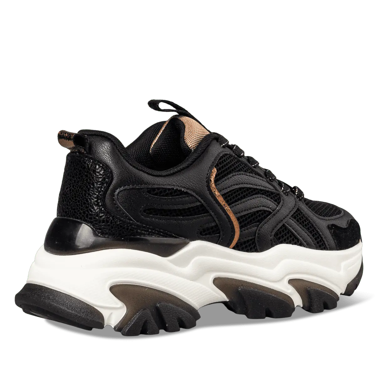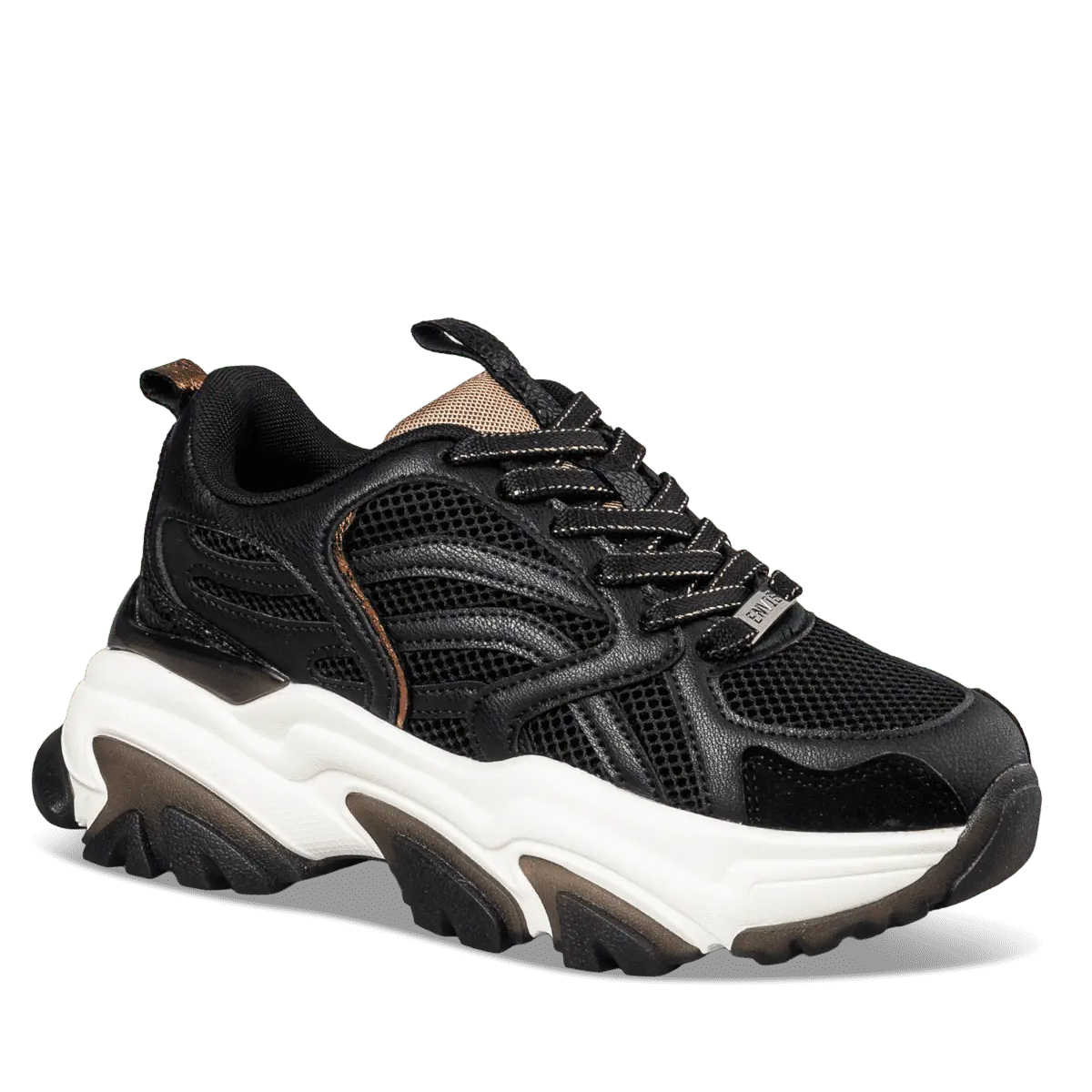 Γυναικεία sneakers Envie σε μαύρο χρώμα, με chunky σόλα σε διχρωμία για urban chic στυλ. Κατασκευασμένα από ποιοτικό ύφασμα και EcoLeather, προσφέρουν άνεση και αντοχή για όλη τη μέρα. Ιδανικά για casual και streetwear εμφανίσεις.