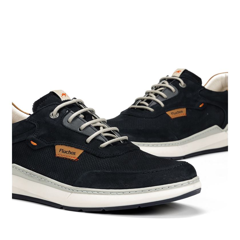 Ανδρικά Παπούτσια Δετά της εταιρείας Fluchos, κωδ. F2210, με Δέρμα Nabuk εξωτερικά και με Δέρμα εσωτερικά. Διατίθεται σε χρώμα Μπλε. Το σχέδιο της εταιρείας Fluchos  σε Μπλε χρώμα, θα σας καλύψει σε όλα τα προσεγμένα ντυσίματά σας. Τίποτα άλλο δεν είναι πιο σικάτο και στιλάτο από ένα ζευγάρι προσεγμένα δερμάτινα παπούτσια με κορδόνι ή χωρίς που θα ολοκληρώσουν το look σας ανάλογα την κάθε περίσταση. Και όταν λέμε επίσημα δεν αναφερόμαστε σε παπούτσια που θα τα φορούσατε μόνο με κουστούμι ή σε σπάνιες περιπτώσεις, αλλά σε ξεχωριστά είδη παπουτσιών που άντεξαν μέσα στο χρόνο και έχουν καθιερωθεί ως ένδειξη του στυλ, όπως για παράδειγμα, Oxford shoes, Derby shoes και Monk straps.