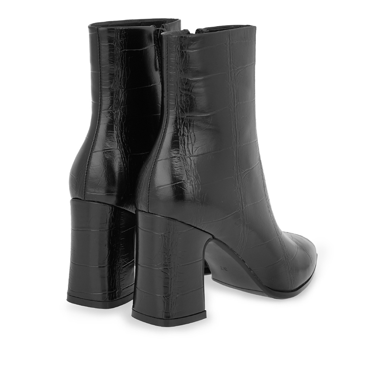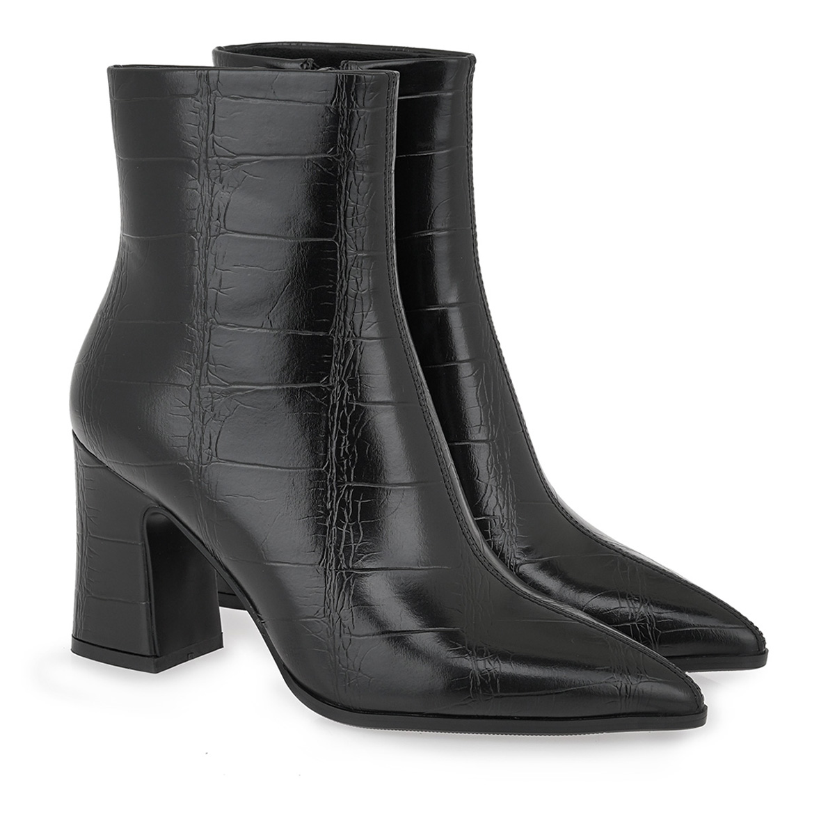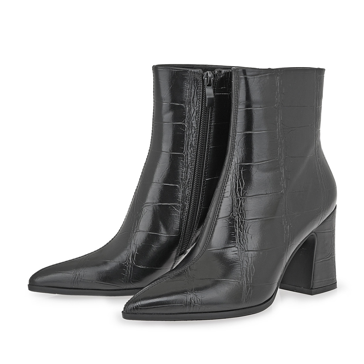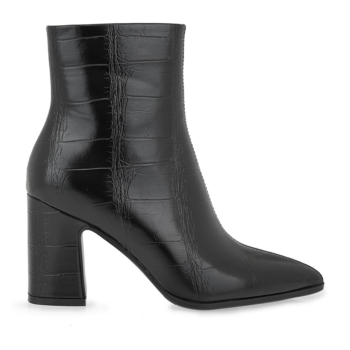 Μποτάκια Seven σε μαύρο χρώμα με κομψό κροκό μοτίβο που χαρίζει πολυτελή υφή και στυλ. Διαθέτουν μυτερή γραμμή και σταθερό τετράγωνο τακούνι ύψους περίπου 6 cm, ιδανικό για άνεση και κομψότητα όλη μέρα. Ένα σχέδιο που ξεχωρίζει, εύκολο να συνδυαστεί με τζιν, φούστες και φορέματα για ιδιαίτερα στυλάτες εμφανίσεις.