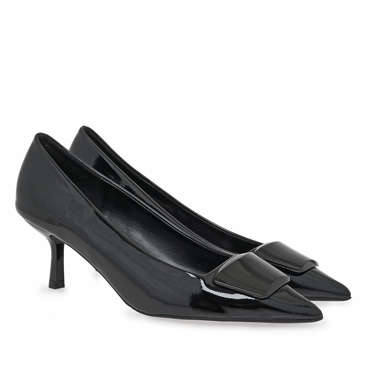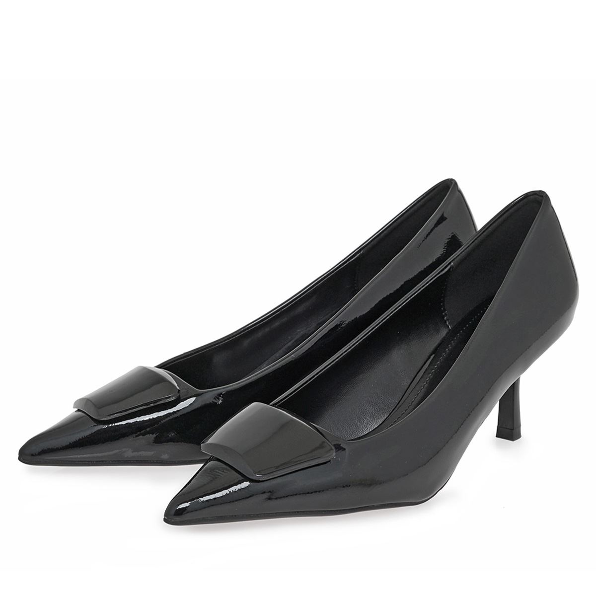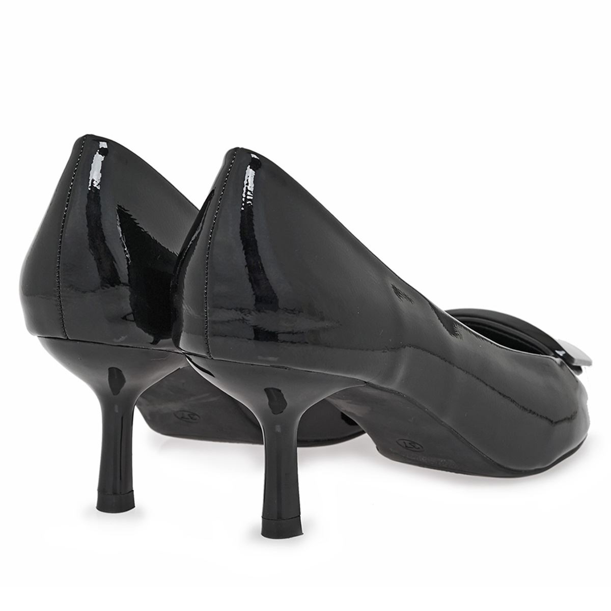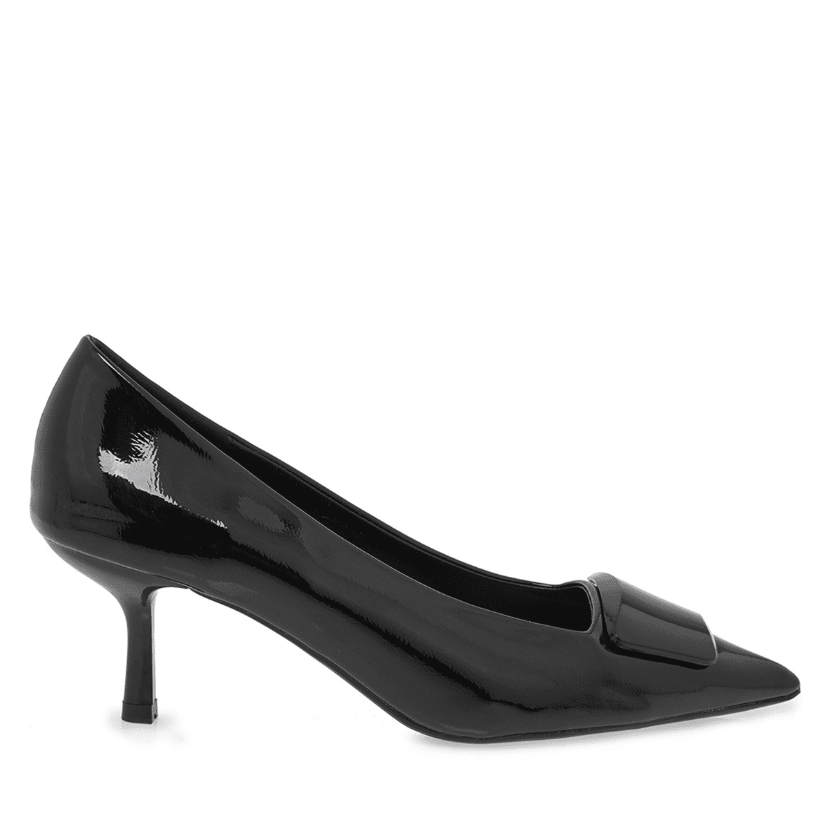 Μια γυναικεία γόβα Seven σε μαύρο λουστρίνι που συνδυάζει κομψότητα και στυλ. Το διακριτικό διακοσμητικό στο μπροστινό μέρος δίνει μοντέρνα πινελιά, ενώ το διαχρονικό σχέδιο την καθιστά ιδανική για κάθε περίσταση.