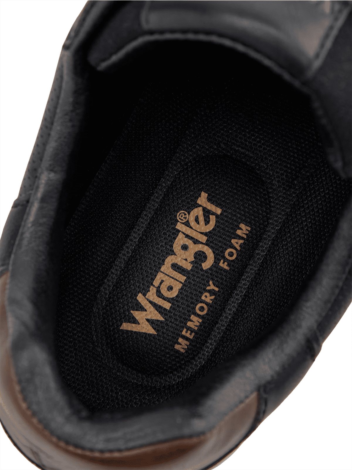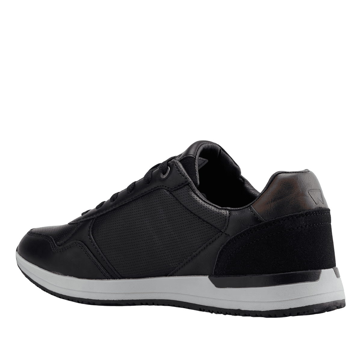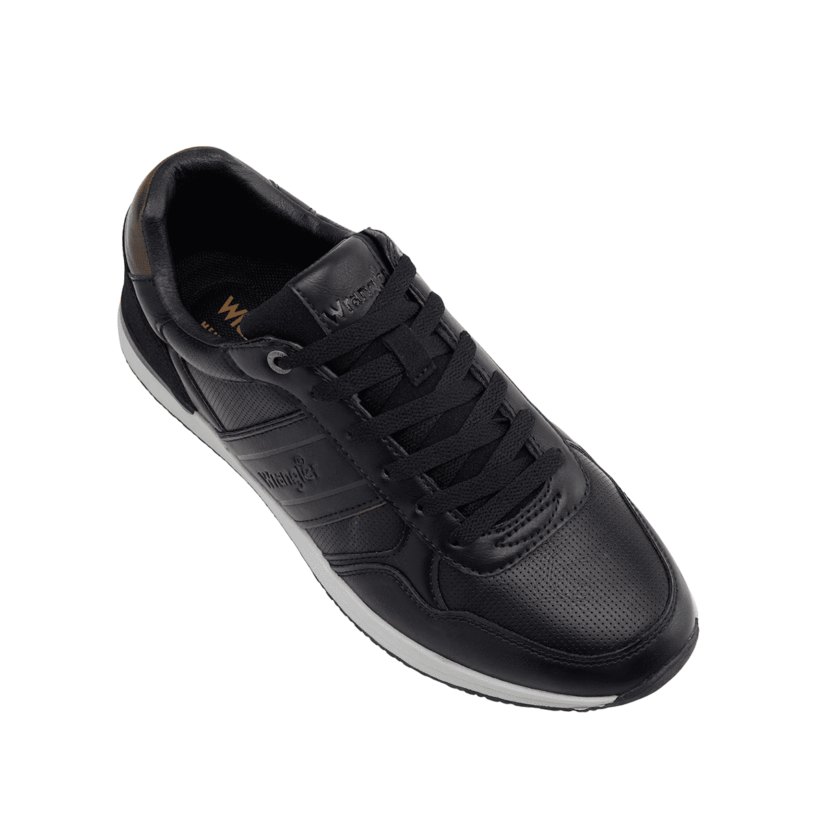Ανδρικά sneakers της Wrangler σε μαύρο χρώμα με κομψές καφέ λεπτομέρειες στο πίσω μέρος. Κατασκευασμένα από ποιοτικά υλικά με διακριτικό logo στο πλάι, προσφέρουν άνεση και στήριξη σε κάθε βήμα. Ο sport–casual σχεδιασμός τους τα καθιστά ιδανική επιλογή για καθημερινές εμφανίσεις, αλλά και για πιο μοντέρνα outfits.